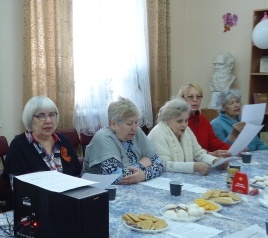 Перед членами Клуба «Саквояж» выступили участники творческой агитбригады «Молодые мы, молодые» (руководитель Галина Кудрявцева), которые исполнили для собравшихся песни и стихи времен Великой Отечественной войны.