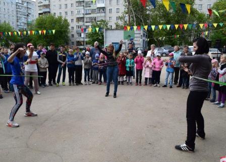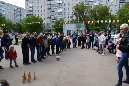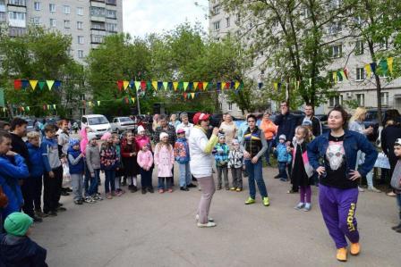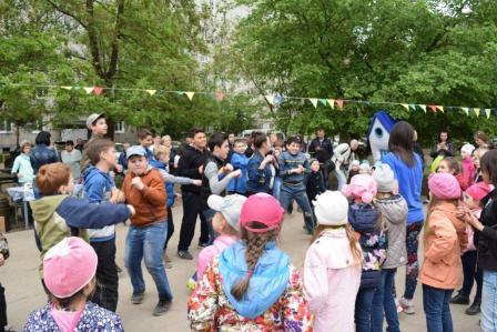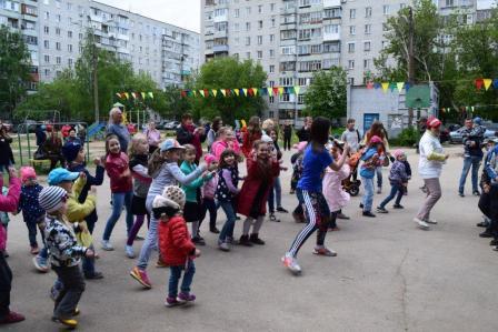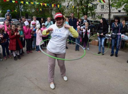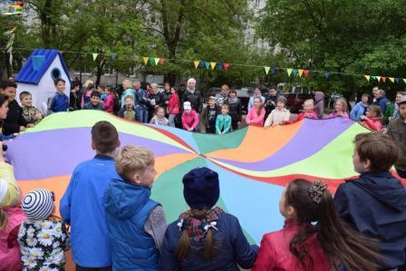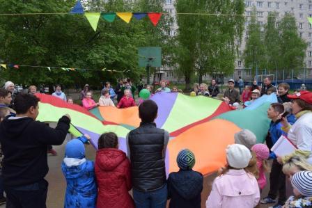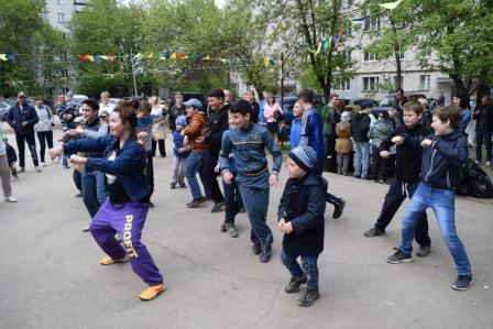 Дети и взрослые с удовольствием участвовали в викторине «Я здесь живу. Я знаю», в конкурсах на самого артистичного соседа, на самого меткого соседа, самого грациозного, самого всезнающего, отгадывали загадки-шутки. Самые маленькие соседи играли в подвижную музыкальную игру «Веселый паровозик». И дети, и родители весело и дружно танцевали и повторяли движения за председателем Совета общественного самоуправления Русяевой Валентиной Александровной в музыкальных играх «Карусель», «Помогатор», играли с красочным парашютом.