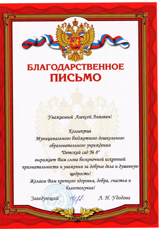 23.08.2017Благодарность депутату Алексею Гойхману за ремонт музыкального зала детского сада №8
