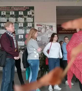 По инициативе председателя Совета общественного самоуправления ТОС поселка Светлоярский и 7-го микрорайона Станислава Воробьева для студентов II курса государственном бюджетном профессиональном образовательном учреждении «Нижегородский техникум городского хозяйства и предпринимательства» организовано посещение музея локальных войн МАОУ «Школа № 79 имени Николая Алексеевича Зайцева». Руководитель школьного музея Е.В. Мордвинова провела со студентами интересную и познавательную беседу на тему «Герои нашего времени».