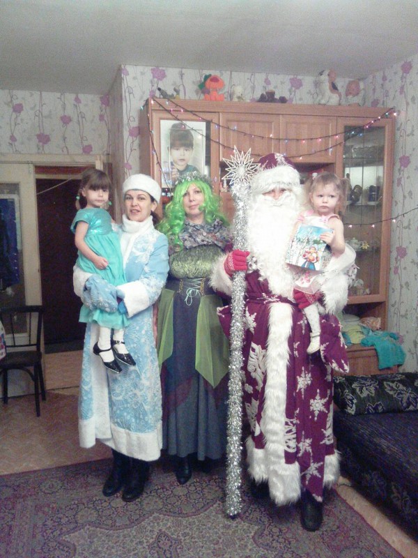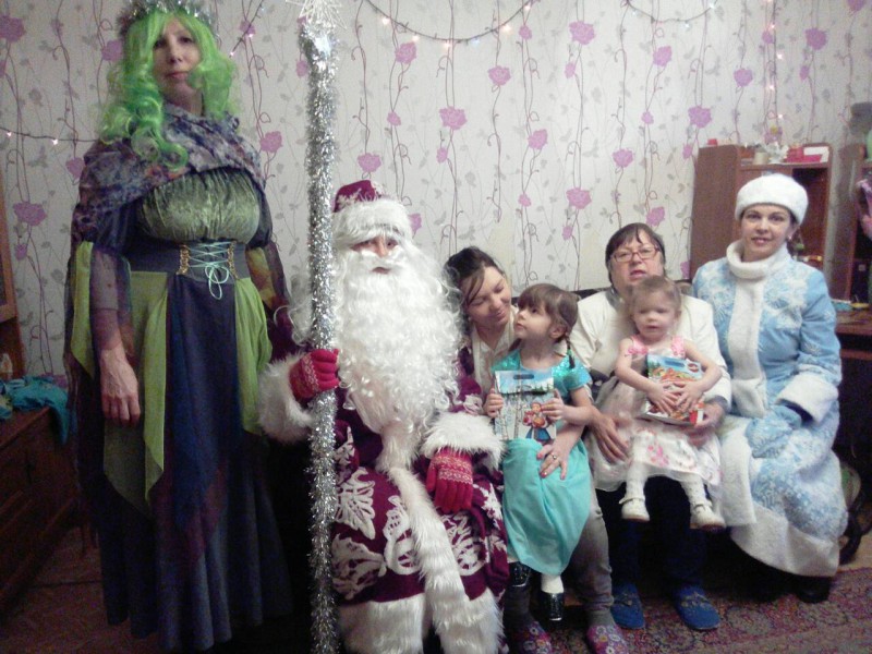 Дед Мороз со Снегурочкой и сказочная Ёлочка пришли в гости к многодетной семье Мариновых, чтобы поздравить их с Новым годом и подарить сладкие подарки. В роли Снегурочки - председатель Совета общественного самоуправления ТОС поселка Народный и V микрорайона Дряхлова Анна, в роли Деда Мороза и Ёлочки сотрудники библиотеки им. М.В. Ломоносова.