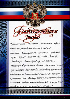 «Муниципальное бюджетное дошкольное образовательное учреждение детский сад № 38 объявляет благодарность депутату городской Думы Нижнего Новгорода Панову Владимиру Александровичу за помощь, оказанную в финансовом вопросе. За летний период при поддержке Владимира Александровича удалось сделать то, что не делалось годами, а именно - ремонт пола в музыкальном зале.