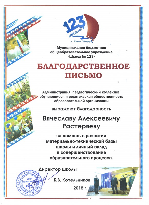 Директор МБОУ «Школа №123» Борис Котельников от имени администрации школы, педагогического коллектива и родителей учащихся выражает благодарность депутату Вячеславу Растеряеву за помощь в развитии материально-технической базы школы и личный вклад в совершенствование образовательного процесса.