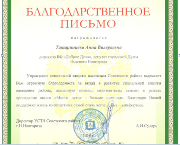 «Акция проводилась при тесном взаимодействии с районными управлениями социальной защиты населения, отделами по работе с семьями и детьми; инвалидами; комиссиями по делам несовершеннолетних; Ассоциацией многодетных семей Нижегородской области; районными администрациями и просто неравнодушными гражданами, в окружении которых были нуждающиеся в помощи семьи. Я выражаю искреннюю признательность всем, кто принял участие в социальном проекте «Много деток – больше помощи». Благодаря нашим действиям жизнь многих семей поменялась к лучшему», - отметила Анна Татаринцева.