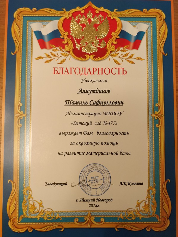 Администрация детского сада № 477 поблагодарила депутата городской Думы города Нижнего Новгорода Шамиля Аляутдинова за помощь в развитии материальной базы детского учреждения. На средства депутатского фонда была заменена кровля на четырех прогулочных верандах и обновлена посуда в пищеблоке.