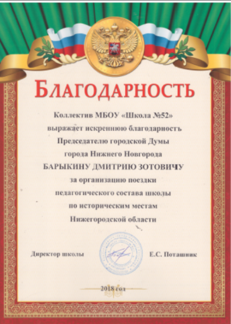 Педагогические коллективы канавинских школ №109 и №52 благодарят депутата городской Думы Нижнего Новгорода Дмитрия Барыкина за организацию экскурсионных поездок по Нижегородской области.