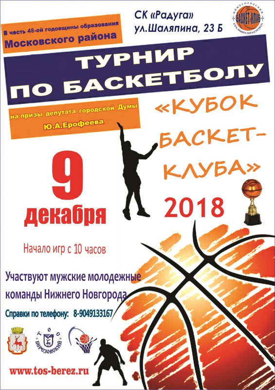 Совет Территориального общественного самоуправления микрорайона «Березовский» и Нижегородский клуб любителей баскетбола «Баскет-клуб» при содействии депутата городской Думы Нижнего Новгорода Ю.А.Ерофеева проводит 9 декабря 2018 года XIII традиционный турнир по баскетболу среди мужских молодежных команд в честь 48-й годовщины со Дня образования Московского района. В рамках памятного турнира планируются не только баскетбольные состязания молодежных сборных, но и различные спортивные конкурсы, а также подведение итогов фотомарафона «Живи спортом!», который проводился по инициативе Совета ТОС с марта 2018 года. Турнир проводится Советом ТОС микрорайона «Березовский» как одно из 14 запланированных в 2018 году спортивных мероприятий Программы развития дворового спорта «30 СПОРТИВНЫХ ДВОРОВ». Приглашаем зрителей и болельщиков в воскресенье в спортивный комплекс «Радуга» (ул.Шаляпина, 23 «б») поддержать любимые команды. Начало турнирных игр в 10 часов.