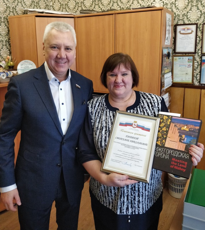 Депутат вручил Светлане Паниной памятный подарок и почетную грамоту за многолетний творческий труд по воспитанию и развитию детей дошкольного возраста.