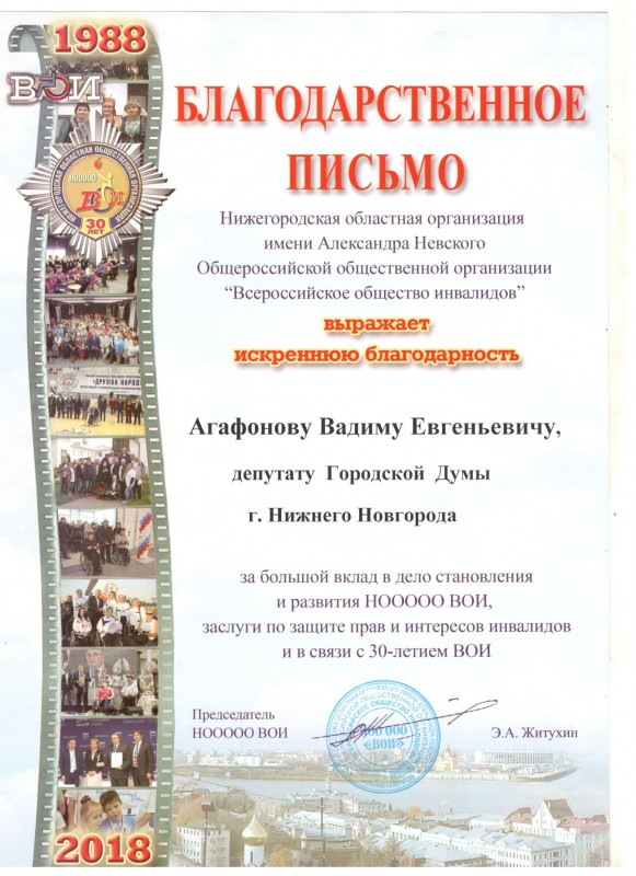 На встрече с общественными организациями в декаду инвалидов председатель Нижегородской районной организации Всероссийского общества инвалидов Нина Ивановна Яшонкова поблагодарила депутата городской Думы Нижнего Новгорода Вадима Агафонова за многолетнее сотрудничество и помощь людям с ограниченными возможностями. Нина Ивановна также передала ему благодарственное письмо Нижегородской областной организации имени Александра Невского, в котором отмечается большой вклад депутата в дело становления и развития общественной организации, заслуги по защите прав и интересов инвалидов.