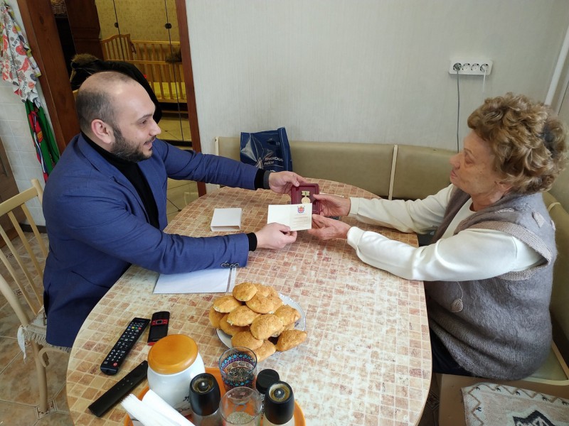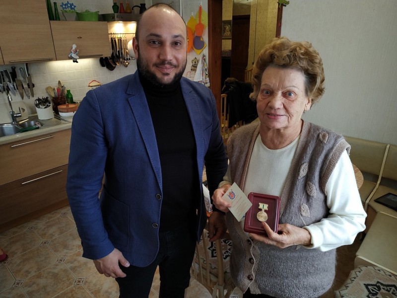 После беседы, депутат вручил ветерану удостоверение и памятный знак «В честь 75-летия полного освобождения Ленинграда от фашистской блокады», передал тематические рисунки и открытки с теплыми словами от школьников Приокского района и сладкий набор к чаю.