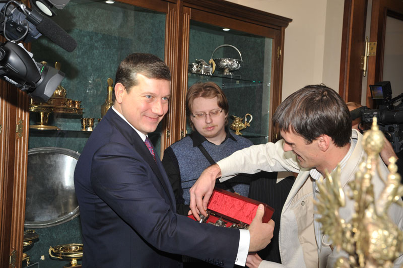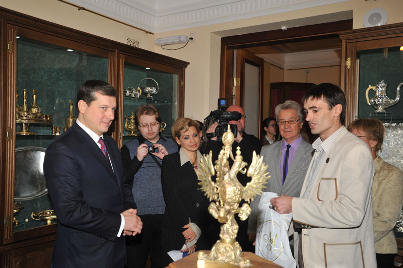 Сегодня глава Нижнего Новгорода Олег Сорокин принял участие в торжественном мероприятии по случаю открытия в Нижегородском государственном историко-архитектурном музее-заповеднике «Усадьба Рукавишниковых» новой экспозиции. В нее вошли уникальные старинные предметы, так называемого «спецхранения». Эти вещи до сих пор находились в запасниках – их могли видеть только хранители музея. Олег Сорокин выделил из личных средств 6 млн. рублей на изготовление и установку специального оборудования, которое позволяет обеспечить сохранность и безопасность уникальных ценностей. Глава города напомнил, что история возникновения новой экспозиции началась более года назад, когда Олег Сорокин из личной коллекции передал музею подносное блюдо, которое в 1913 году депутаты нижегородской городской думы подарили Императору Николаю II. «Есть вещи, которые неразрывно связаны с историей города. И конечно, эта реликвия должна была принадлежать всем нижегородцам, поэтому я передал его в музей. Но в музее не могли гарантировать сохранность этого ценнейшего экспоната, поэтому год назад мы начали этот проект», - сообщил журналистам Олег Сорокин.