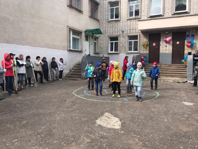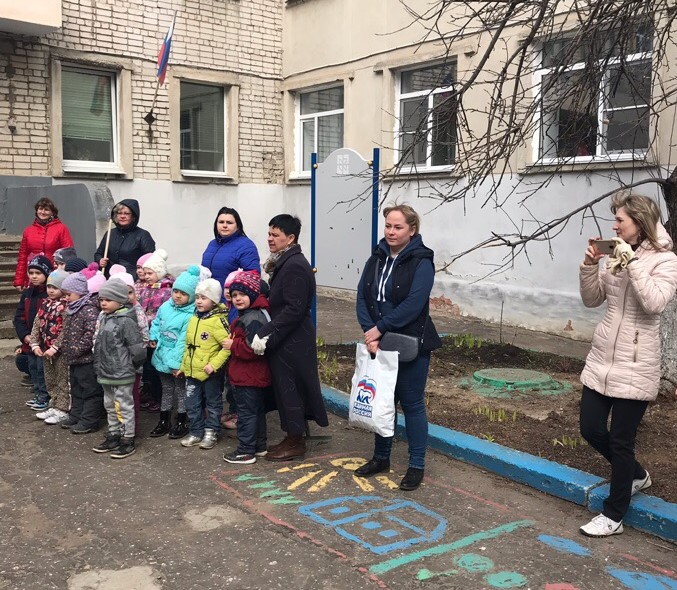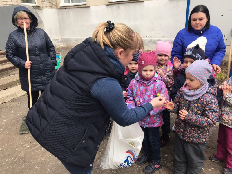 Перед началом субботника воспитанники дошкольного учреждения показывали творческие номера, отгадывали загадки, пели песни и танцевали. Подарком от партии послужили сладости для всех детишек.