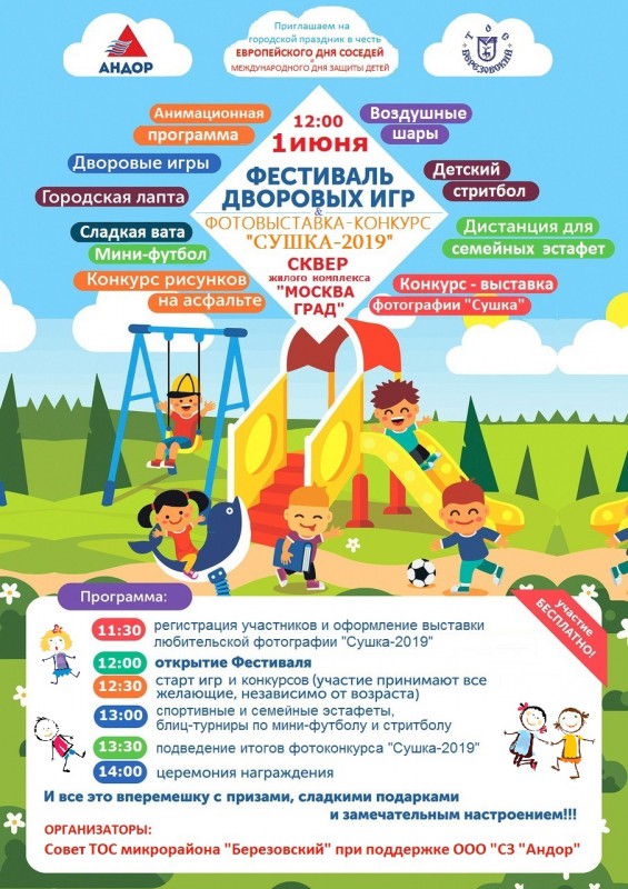 1 июня в сквере ЖК «Москва Град» (Московское шоссе, 167) Советом общественного самоуправления ТОС микрорайона «Березовский» проводится V выставка-конкурс любительской фотографии «Сушка-2019» и праздник для горожан «Фестиваль дворовых игр», посвященные Международному дню соседей и Дню защиты детей. В программе праздника: конкурсы и викторины детских аниматоров; игровые зоны «Дворовые игры»; - спортивные эстафеты для всей семьи; блиц-турниры по стритболу и мини-футболу; выставка-конкурс любительской фотографии «Сушка-2019»; конкурс рисунков на асфальте; информационные точки волонтеров проекта «Левинка — река для жизни» и Клуба спортивных волонтеров «На старт!»; награждение победителей конкурсов и вручение сертификатов выпускникам Школы молодежного актива ТОС «Креатив» и благодарственных писем активным жителям и волонтерам. Праздник организован при поддержке депутата городской Думы Нижнего Новгорода Р.А.Буланова и ООО «Строительная компания «Андор».