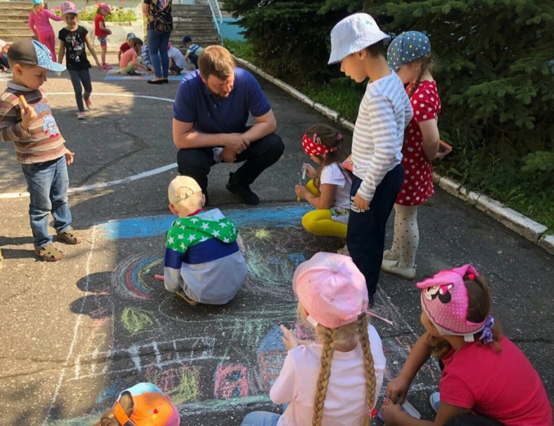 По традиции в детском саду прошел конкурс рисунков на асфальте. Воспитанники учреждения нарисовали свои картины на тему «Дорога от дома до садика». Пока взрослые наносили разметку пешеходного перехода, ребята нарисовали рядом с ним светофоры, пешеходов, дорожные знаки.