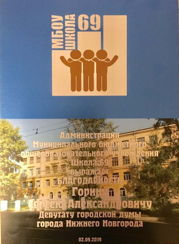 Депутат городской Думы Нижнего Новгорода Сергей Горин выделил средства для проведения ремонта в холле школы № 69 Московского района. Директор школы Алексей Тимофеев поблагодарил депутата за оказанную спонсорскую помощь.