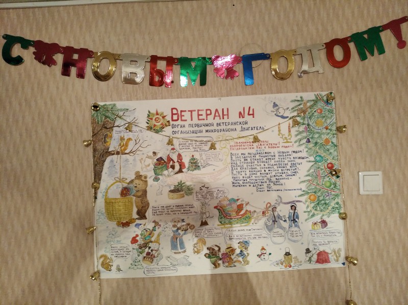 16 декабря в микрорайоне «Двигатель» вышел очередной выпуск стенгазеты «Ветеран». Члены редакционной коллегии, председатель первичной организации Совета ветеранов Литвинова Г. В., председатель Совета ТОС микрорайона «Двигатель» Попова В.И. и члены Совета Старжинская Г. А. и Тужилкина Р.А. подготовили стенгазету, посвященную Новому году и Рождеству. Накануне Нового года было выпущено 50 листовок с новогодними и Рождественскими поздравлениями жителей микрорайона «Двигатель». Новогодние листовки были размещены на информационных щитах и подъездах жилых домов микрорайона.