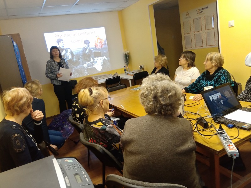 10 марта Совет общественного самоуправления ТОС «1 микрорайон» совместно с библиотекой имени Бориса Корнилова провели для жителей микрорайона литературно-музыкальный вечер «Эти песни спеты на войне», посвящённый песням военных лет. В трудные годы Великой Отечественной войны песни помогали народу выстоять и победить. Прошли годы, а песни военных лет звучат и сегодня, потрясая сердца. Сотрудники библиотеки Светлана Зимина и Инна Сёмушкина подготовили мультимедийную презентацию, в которой рассказали участникам вечера, когда и при каких обстоятельствах, появлялись песни. Жителям были предоставлены к прослушиванию песни: «Священная война», которая стала гимном ненависти и мести к фашистским захватчикам, «Моя Москва», первая лирическая песня «В землянке», «Прощай любимый город», «В лесу прифронтовом», фронтовая «Катюша», «Тёмная ночь», «Случайный вальс», «Огонёк», фронтовой вариант «Синего платочка» в исполнении Клавдии Шульженко и новый вариант песни «Моя любимая» в исполнении Людмилы Гурченко. Песни военных лет любят не только за простоту и душевность, мелодичность и красоту, главное их достоинство — стойкий оптимизм, неиссякаемая вера в добро, человеческие ценности, за которые люди шли на подвиг и смерть.