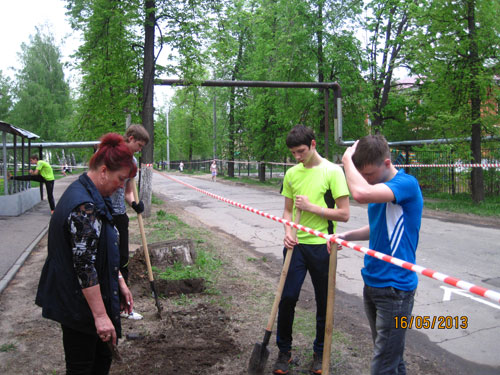 16 мая активисты ТОС микрорайона «Орджоникидзе»: Якимычев Алексей, Бодышнов Влад и Кончин Максим - учащиеся группы ТМ- 12 технического авиационного колледжа (директор Жильникова Галина Николаевна), Кротова Ольга Владимировна - хозяйка магазина «Палисад» и Минькова Ольга Анатольевна - член совета общественного самоуправления ТОС микрорайона «Орджоникидзе» с энтузиазмом трудились на территории возле Дворца культуры им. С.Орджоникидзе готовя площадку для посадки декоративных кустарников.