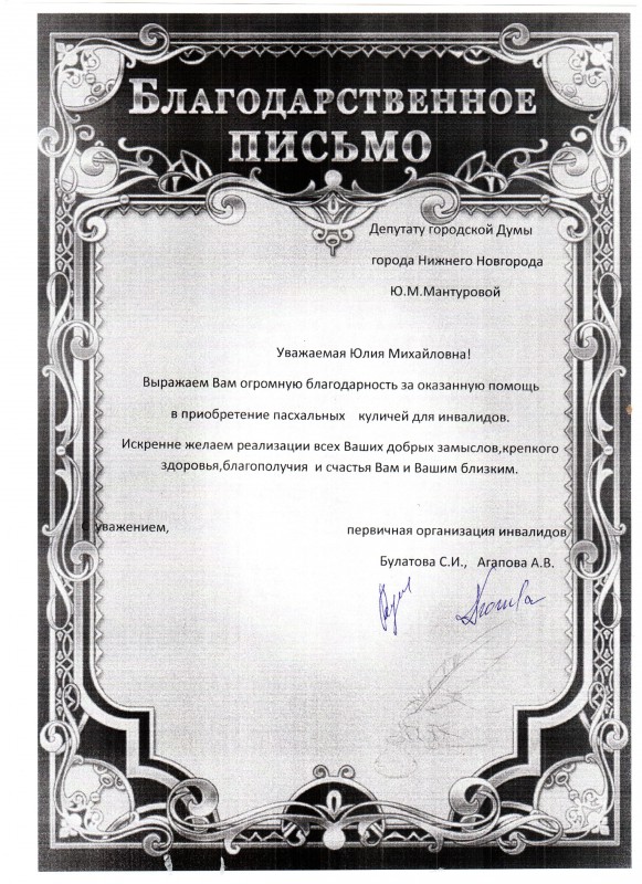 Отделение Нижегородской областной общественной организации «Всероссийское общество инвалидов» Московского района выразило благодарность депутату городской Думы Нижнего Новгорода Юлии Мантуровой за помощь в приобретении пасхальных куличей для подопечных общества.